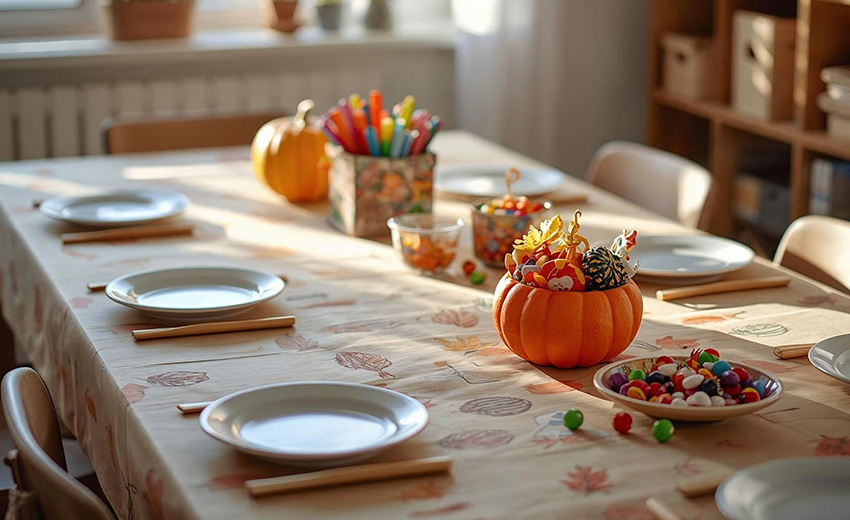 Diseñar un espacio especial para los niños los hace sentir parte de la celebración. Un mantel de papel donde puedan dibujar, crayones y pequeños detalles como una mini calabaza con su nombre son suficientes para despertar su entusiasmo.