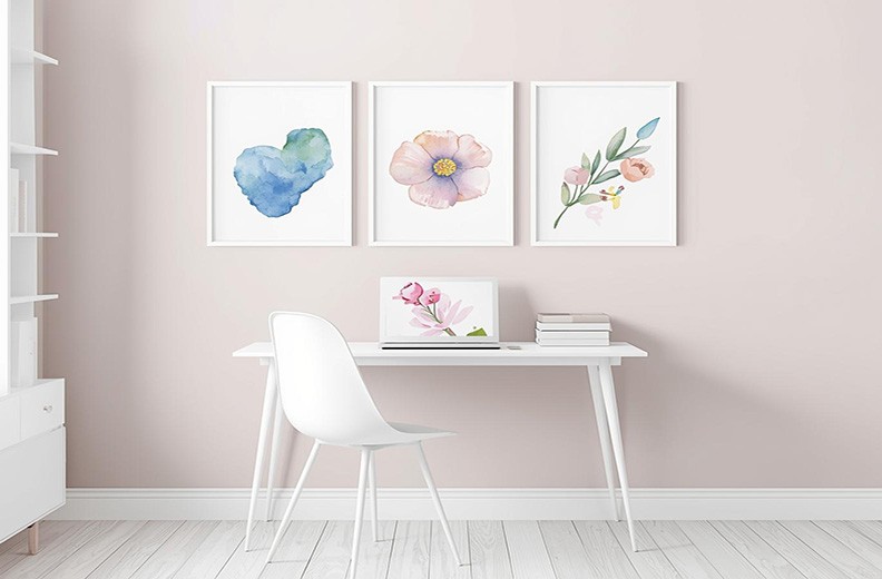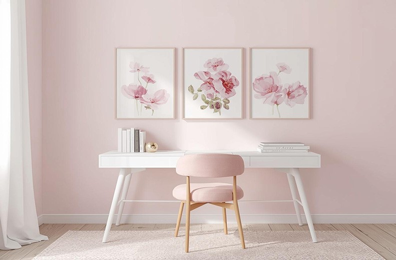 Ambiente delicado y romántico con tres cuadros de flores en acuarela rosada. Escritorio blanco con silla tapizada en rosa y detalles minimalistas en libros y decoración.
