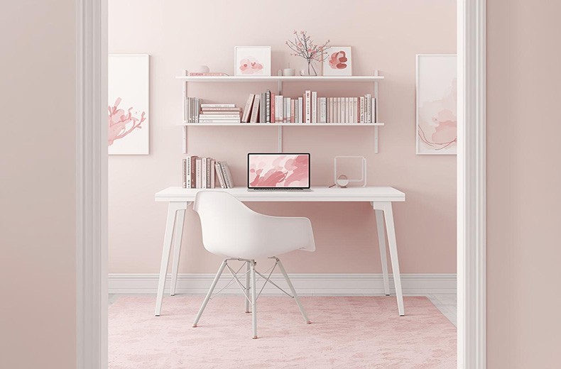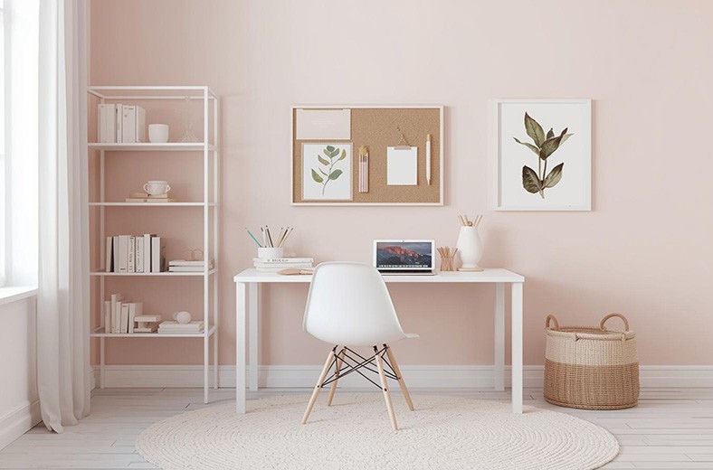 El rosa pastel transmite calma, dulzura y elegancia. Es un color que suaviza el ambiente y lo llena de luz, ideal para un escritorio donde necesitamos foco pero también belleza. Además, esta paleta combina muy bien con blancos, beige y toques de madera clara, aportando un aire femenino y moderno.