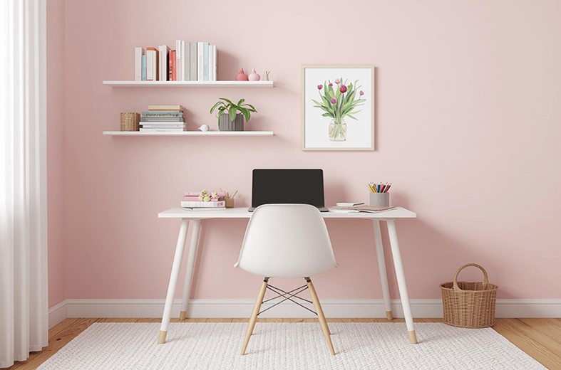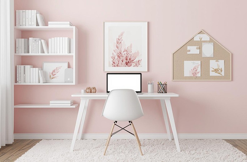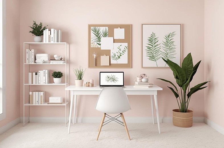 Ambiente fresco con pared rosa y un escritorio con laptop. Se destacan un corcho en forma de casita y repisas flotantes blancas llenas de libros. El arte mural combina hojas en acuarela.