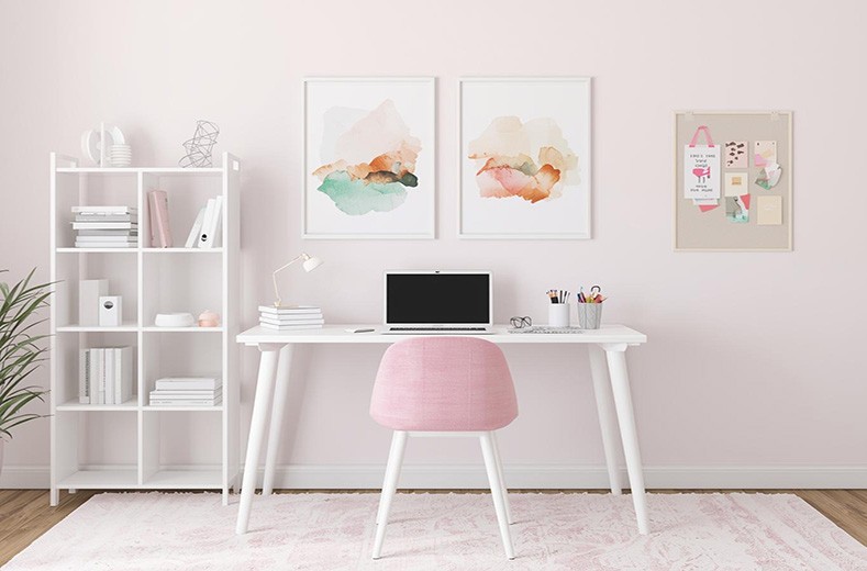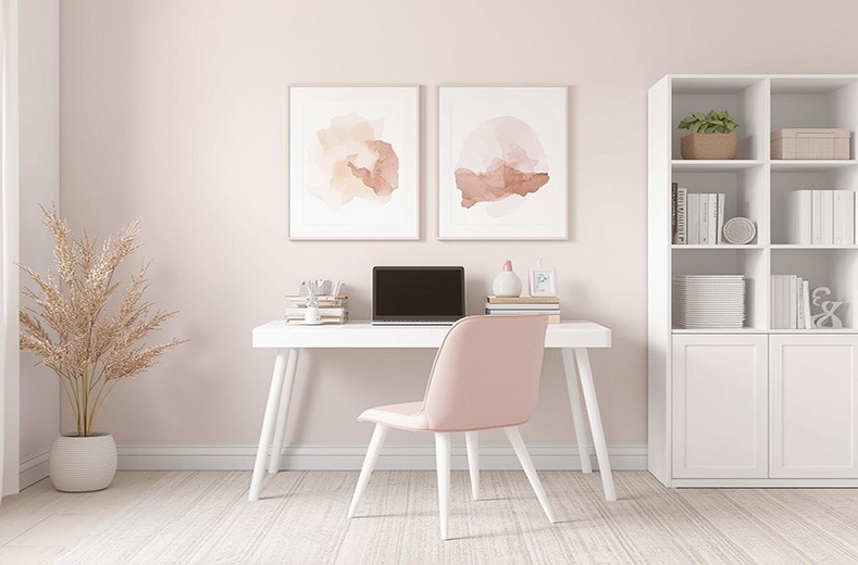 Un escritorio con silla rosada, acompañado de un mueble blanco cerrado con repisas. Dos cuadros abstractos en tonos tierra-rosados y un florero con ramas secas aportan calidez.